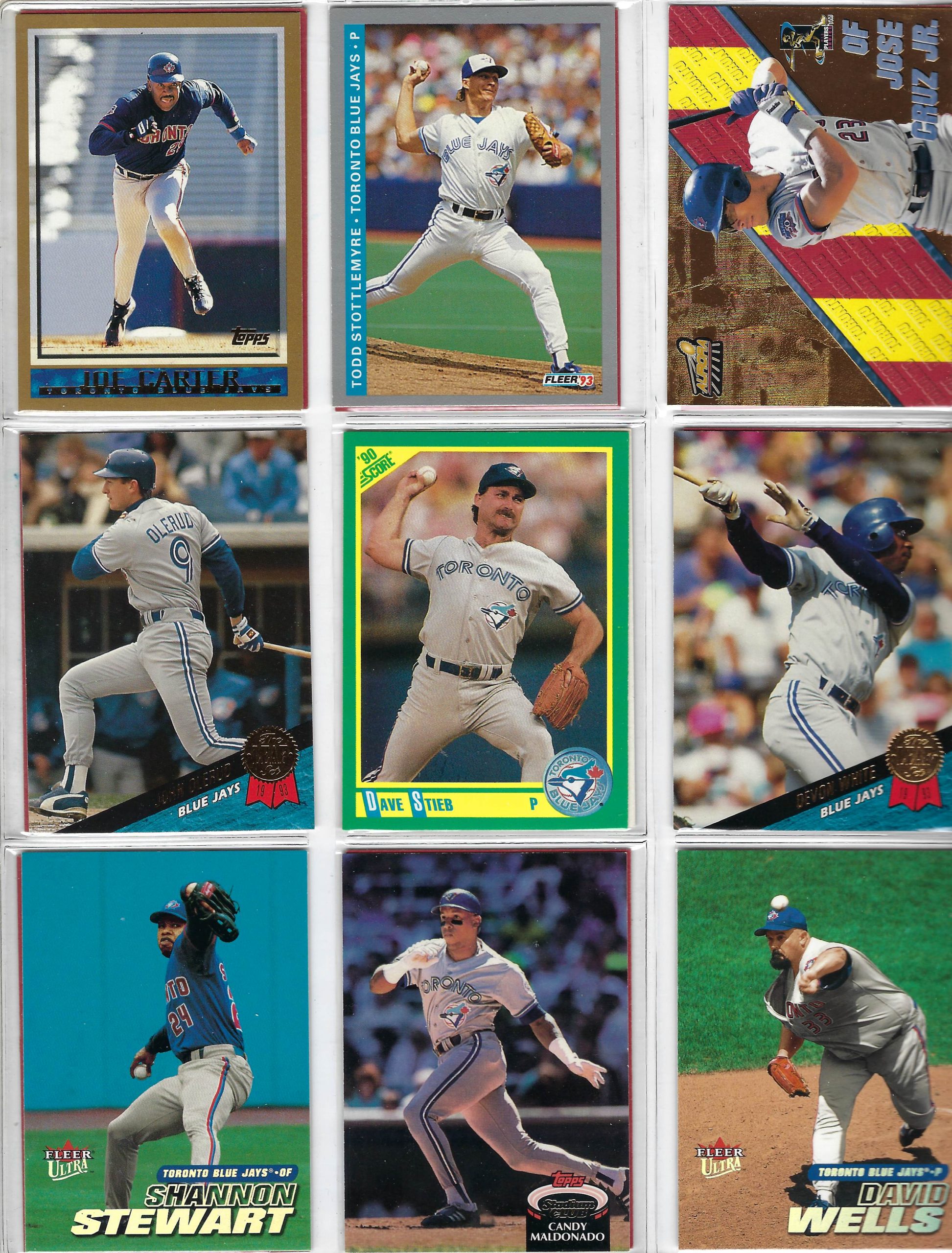 9-pocket binder pages filled with professional baseball trading cards from roughly the early 1990s through the early 2000s.